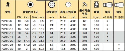 適用介質(zhì):石油基液壓油,水乙二醇,潤(rùn)滑油,空氣和水。用于1.7MPa以上的空氣時(shí),軟管需針刺。