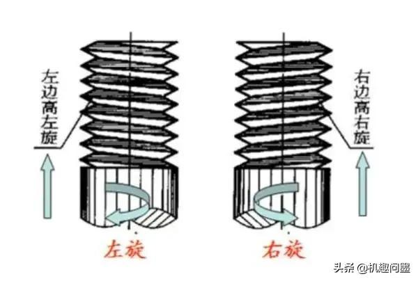 擴(kuò)展:1.螺紋旋向快速判別放法:將螺桿垂直于地面,看螺紋牙的那條斜線,左邊高左旋,右邊高右旋;右旋螺紋順時針擰時旋入,左旋順時針擰旋出,如下圖;