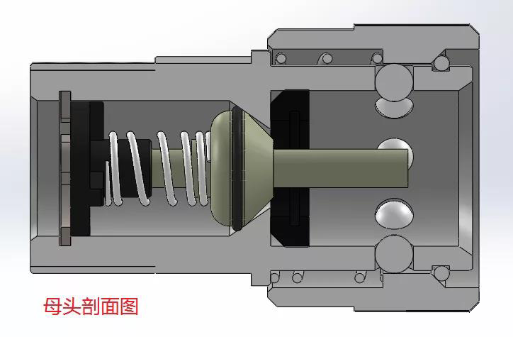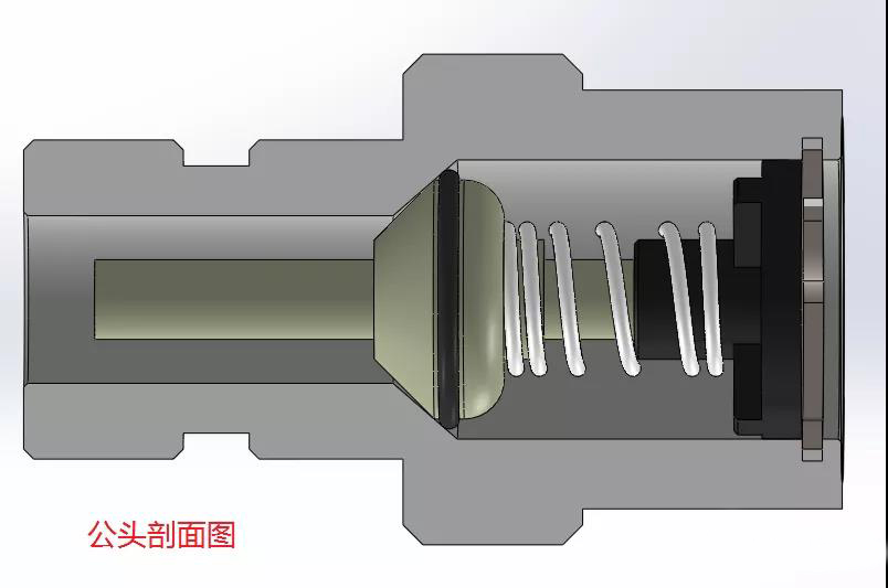 公頭未與母頭裝配時(shí)閥芯在彈簧力的作用下保持封閉,管路不通。公頭一般以螺紋連接的方式固定在閥板上,閥板中的螺紋孔需加密封圈保持密封。